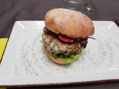Burger de saumon, sauce tartare et pousse épinard, salade composée.